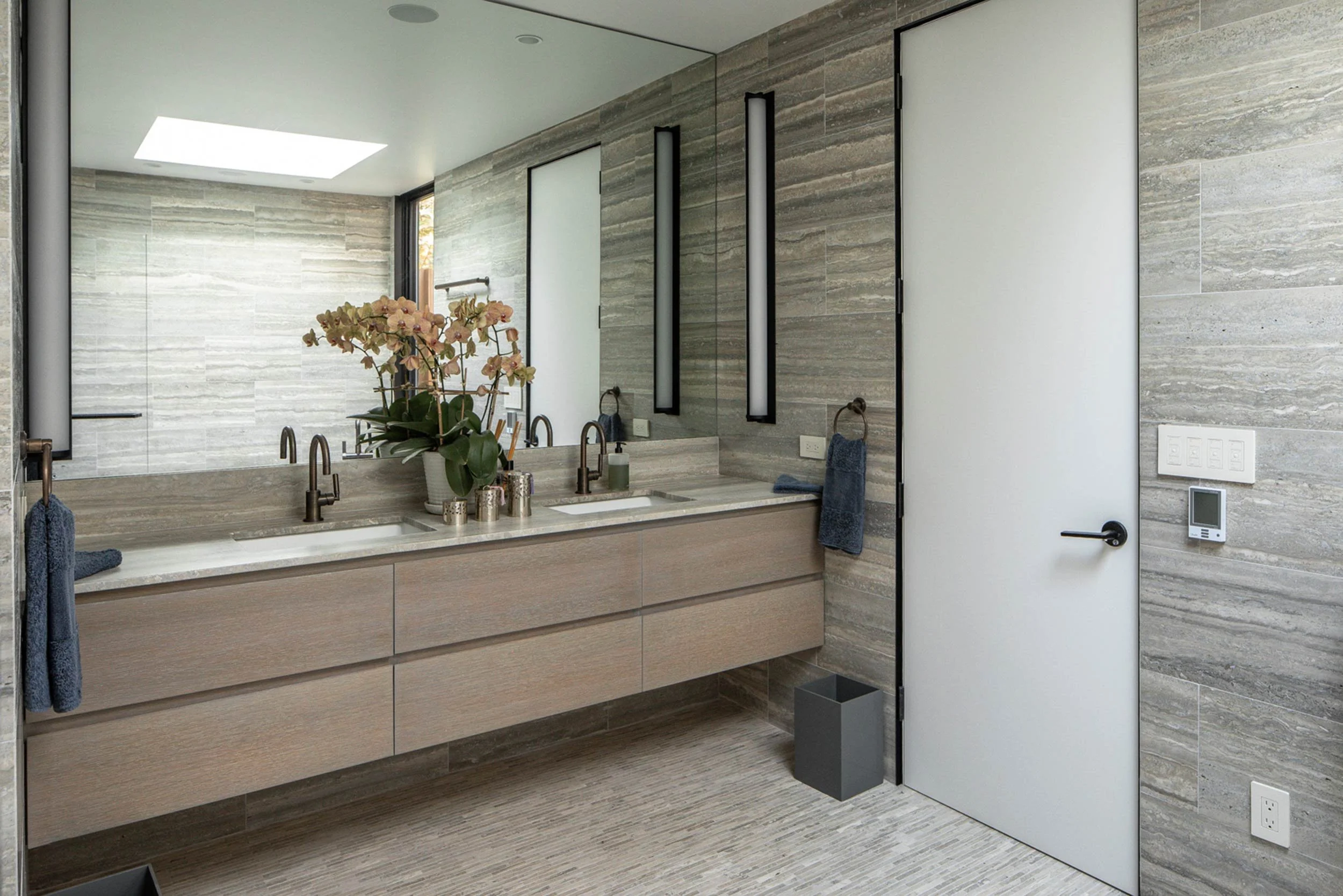Inside, Berg Design collaborated closely with the client, an interior designer, to craft a warm, tranquil interior that balances modernity with comfort. A palette of neutrals is enriched by natural materials: bleached cedar ceilings, white oak cabinetry, taj mahal quartzite countertops, and white oak flooring.